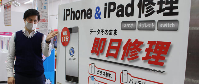 画面割れやバッテリー交換などは最短で10分、平均30分程で修理可能です。『即日対応』を心がけております。